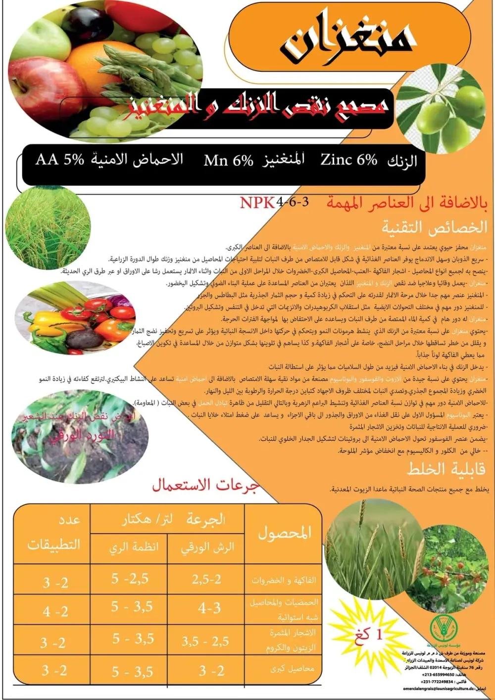| الفاكهة و الخضروات | 2-2.5 كغ / هكتار | انظمة الري: 2.5-5 كغ (2-3 تطبيقات) |