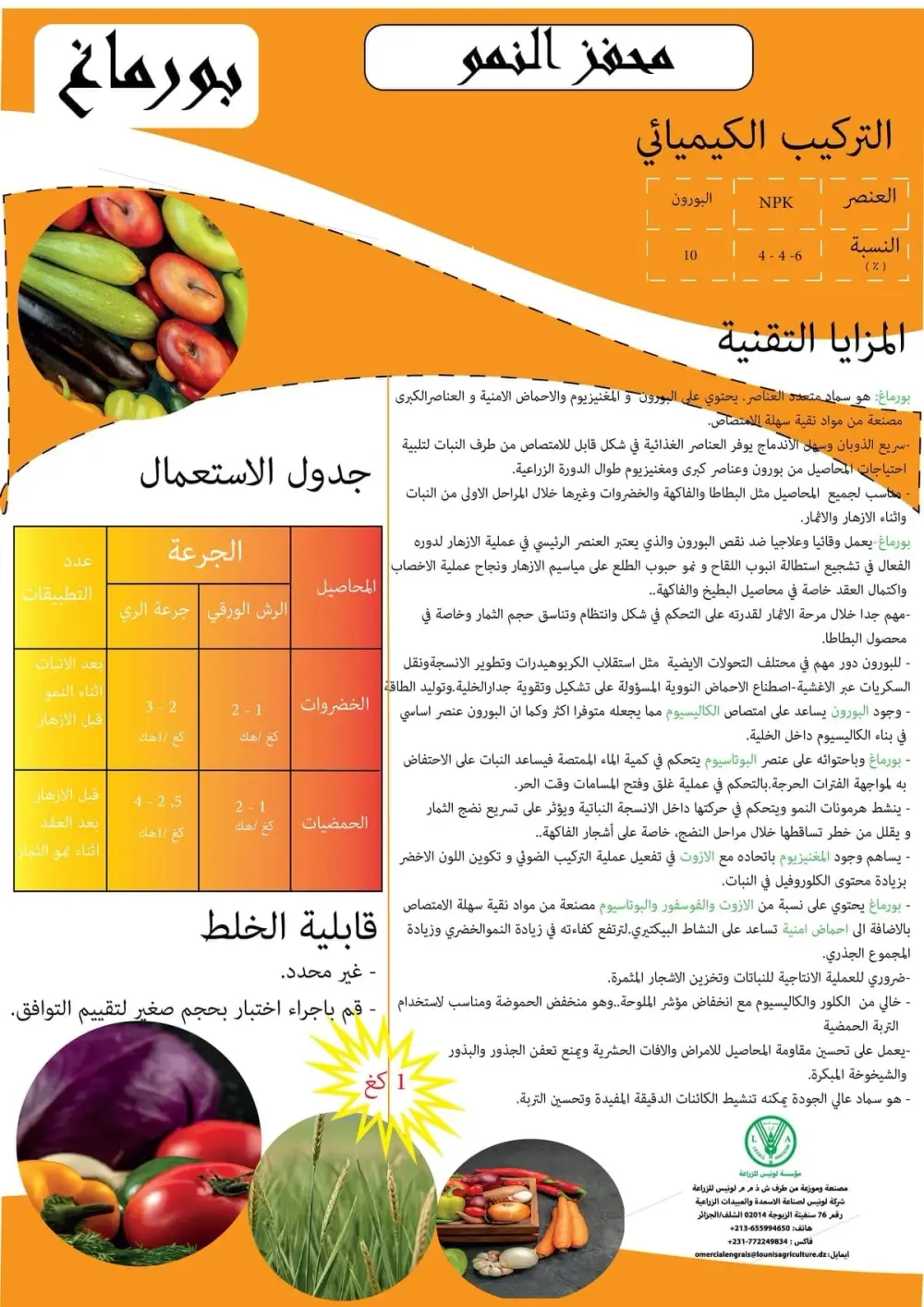 منظم نمو طبيعي: يعمل كمنشط حيوي وقائي وعلاجي ضد نقص البورون الضروري للإزهار والتلقيح ونجاح العقد.