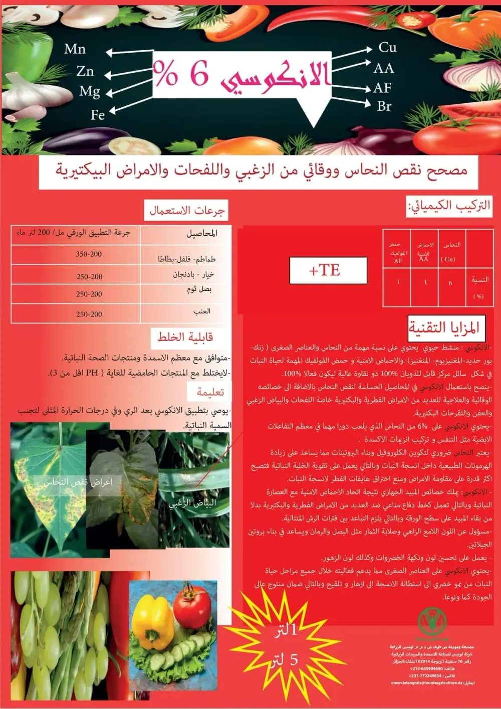 منشط حيوي غني بالنحاس والعناصر الصغرى: يحتوي على نسبة مهمة من النحاس (6%) والزنك الحديد البورون المغنيزيوم والمنغنيز بالإضافة إلى الأحماض الأمينية لضمان فعالية 100%.