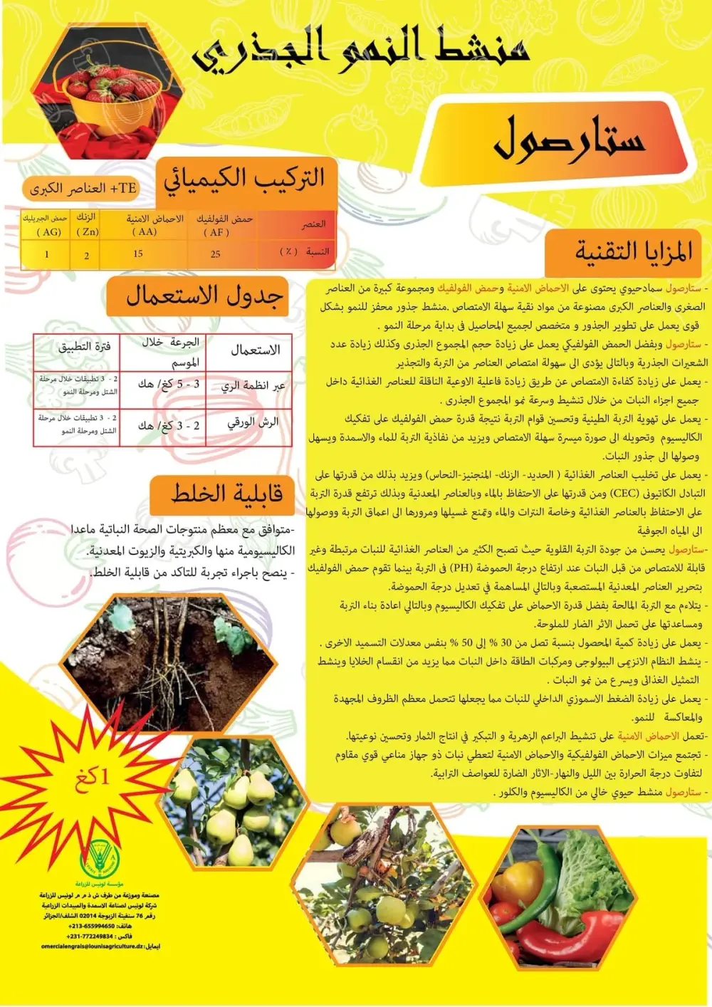 منشط وقوي لنمو وتطور المجموع الجذري للنبات. رج العبوة جيدا قبل الاستعمال.