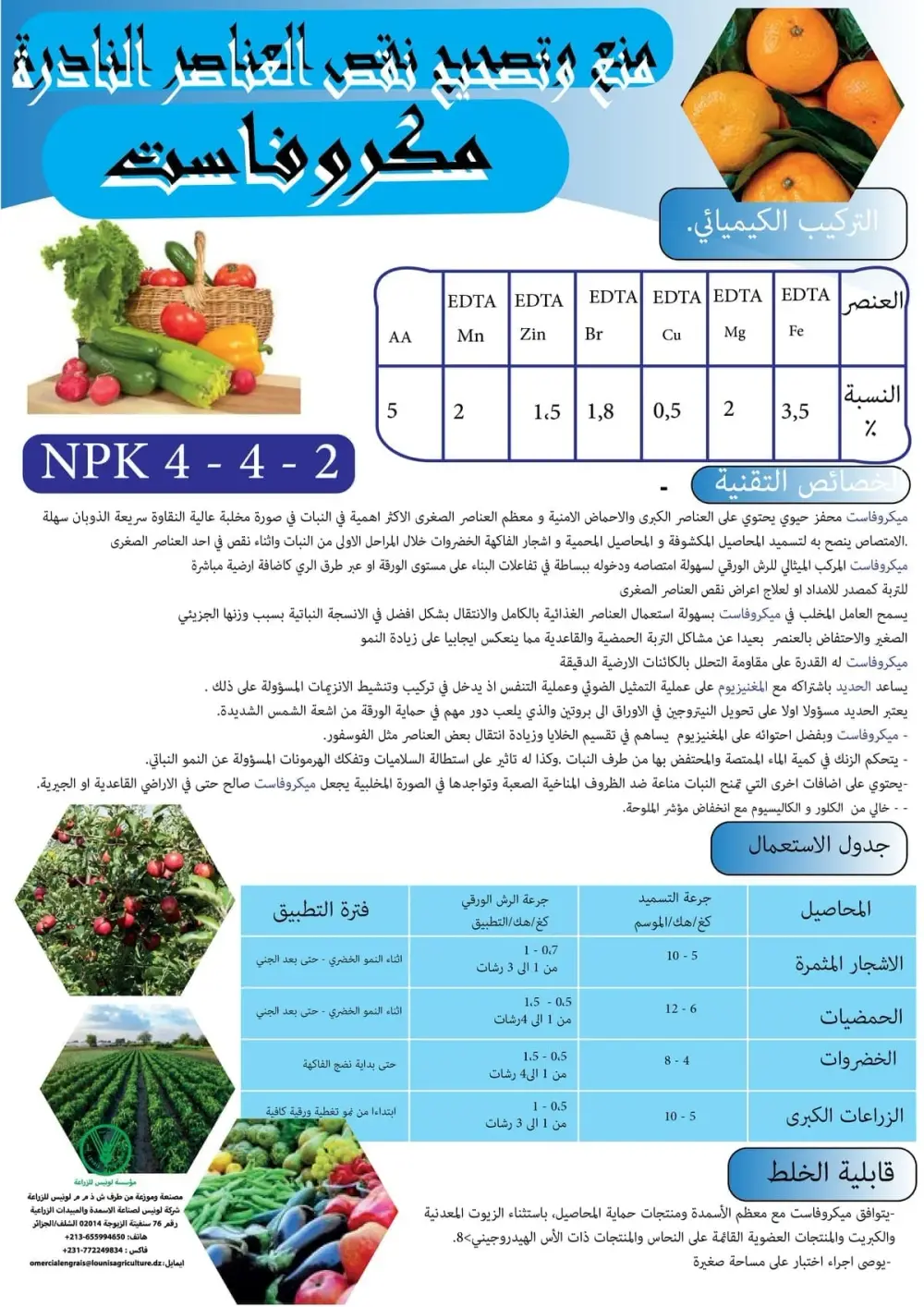 كوكتيل عناصر مخلبة: يوفر تصحيحا شاملا وفوريا لنقص مجموعة واسعة من العناصر الصغرى (Fe, Mg, Zn, Mn, B, Cu) في صورة EDTA سهلة الامتصاص.