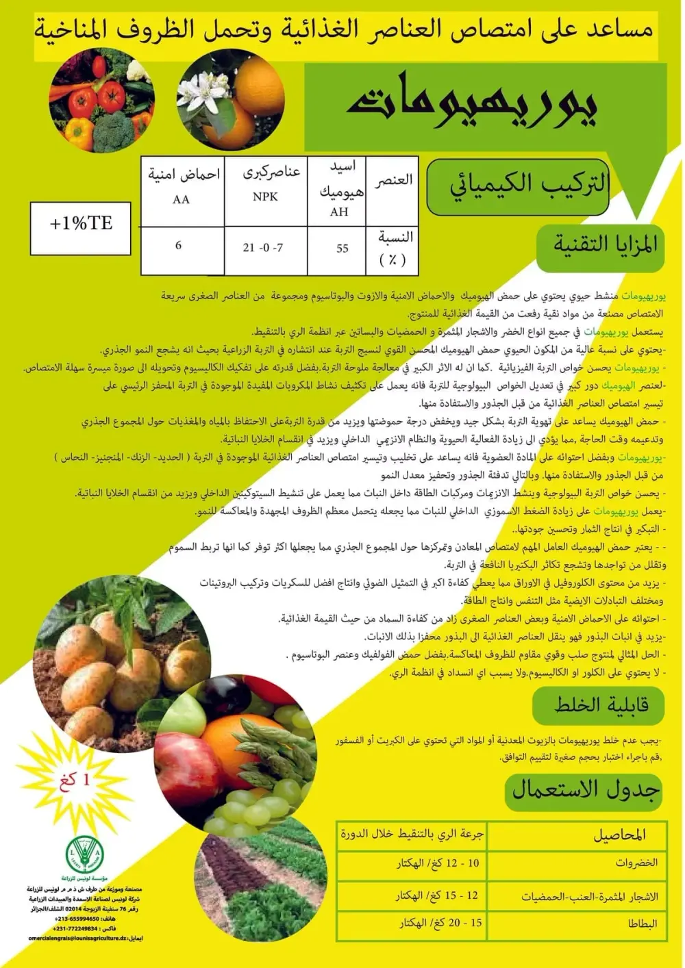 يوريهيومات منشط حيوي يحتوي على حمض الهيوميك الأحماض الأمينية والآزوت والبوتاسيوم مصمم لرفع القيمة الغذائية للمحصول وتحسين الامتصاص.